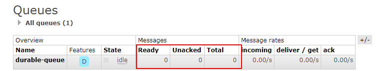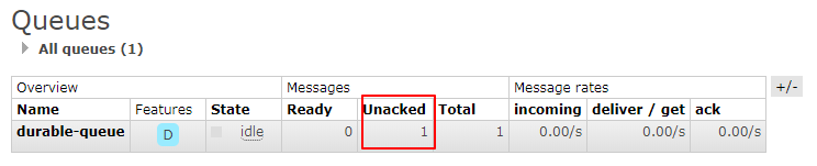 - 已经投递给消费者,但是还没有收到消费者确认信号的消息(下图中的Unacked部分)