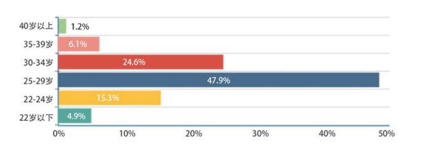 近一半的程序员年龄在25-29岁之间,且35岁以上占一成不到。根据搜狐科技网《中国互联网发展简史》显示,中国1994年正式接入国际互联网,最近一次中国互联网大浪潮是在2009年,PC端互联网转移到移动互联网,中国程序员数量呈井喷式发展。这也解释为什么中国程序员大多年龄集中在25-34岁之间。