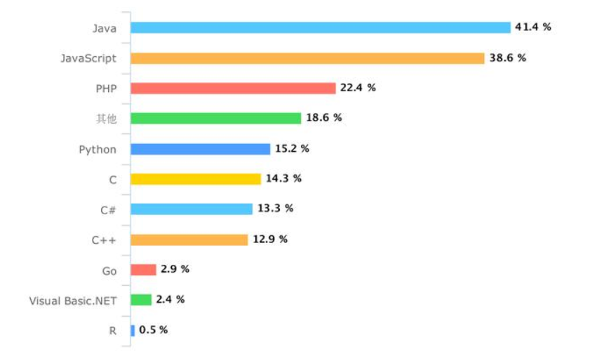 从调查数据可知,程序员擅长语言多为Java(41.4%)、JavaScript(38.6%)和PHP(22.4%)等,另外Python(15.2%)、C语言(14.3%)、C#(13.3%)和C++(12.9%)等也是使用较多的计算机语言。再结合程序员客栈后台4000多名签约开发者的职业方向,与本次调查基本符合。(注:此项为多选,总和大于100%)。