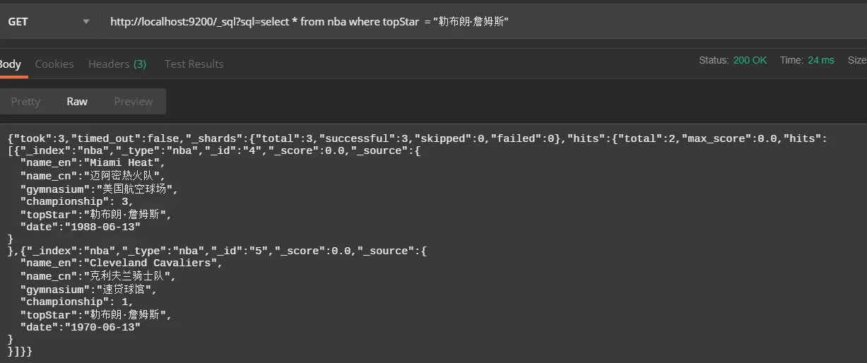 http://localhost:9200/_sql?sql=select * from nba where topStar = "勒布朗·詹姆斯"