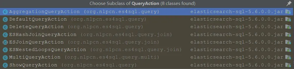 SearchDao 类中有一个explain方法,接收的参数就是一个字符串sql ,返回结果是 QueryAction ,QueryAction 是一个抽象类,它又有如下子类
