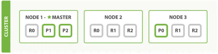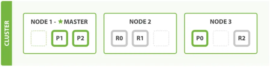 我们的集群现在是下图所示情况,所有3个主分片都被分配在 Node 1 。