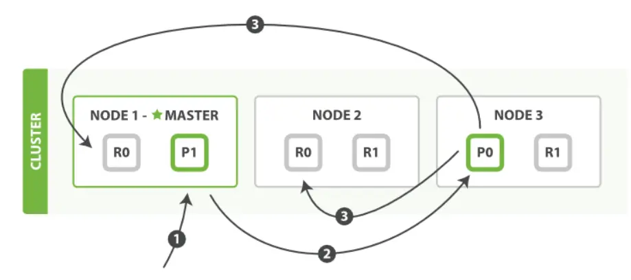 - Node 3 在主分片上面执行请求。如果成功了,它将请求并行转发到 Node1 和 Node2 的副本分片上。一旦所有的副本分片都报告成功,Node 3 将向协调节点报告成功,协调节点向客户端报告成功。