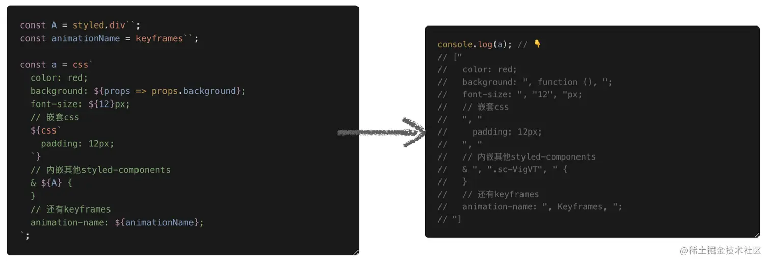 关键在于如何将数组进行扁平化, 这个由 flatten 函数实现. flatten 函数会将嵌套的 css(数组形式)递归 concat 在一起,将 StyledComponent 组件转换为类名引用、还有处理 keyframe 等等. 最终剩下静态字符串和函数, 输出结果如上所示。