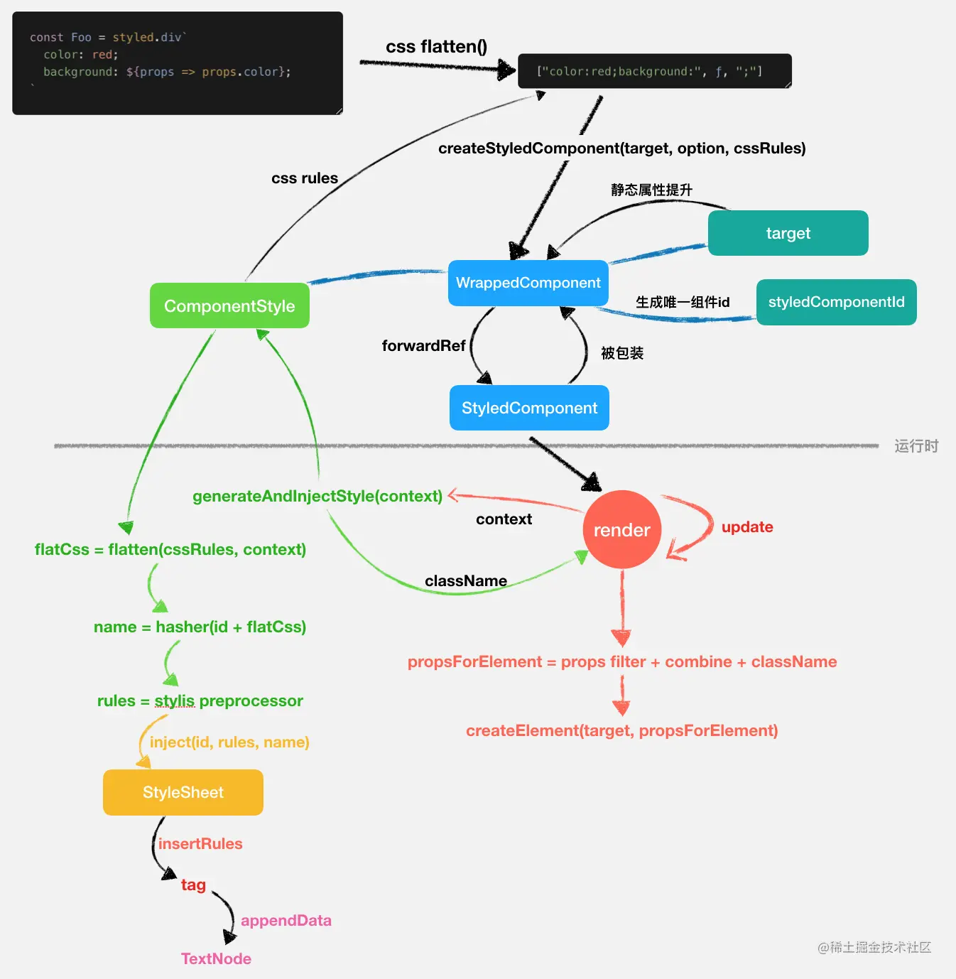 现在来看一下 styled-components 的实现。为了行文简洁,我们只关心 styled-components 的核心逻辑,所以我对源代码进行了大量的简化,比如忽略掉服务端渲染、ReactNative 实现、babel 插件等等.