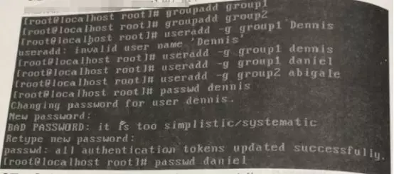 【题1.1】 建立两个用户组group1 和group2, 以及三个用户dennis、daniel、abigale,并且将前2个用户分配在group1 用户组下,最后一个分配在group2用户组下