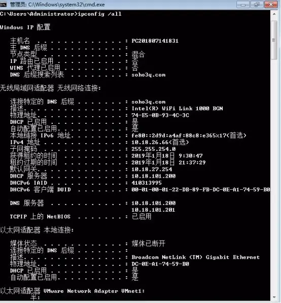 1:查看宿主机的网络配置信息:打开windows的cmd 窗口,输入:ipconfig /all