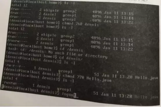 【题1.4】以dennis 用户登录,修改目录/home/dennis 以及Hello.java文件的读写权限(更正:修改目录权限的时候,应该使用770,而不是760,否则权限不足)