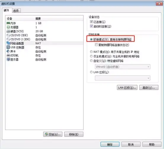 3.虚拟机网络设置:选中虚拟机 -->右键 -->设置 -->网络适配器 -->选择桥接模式