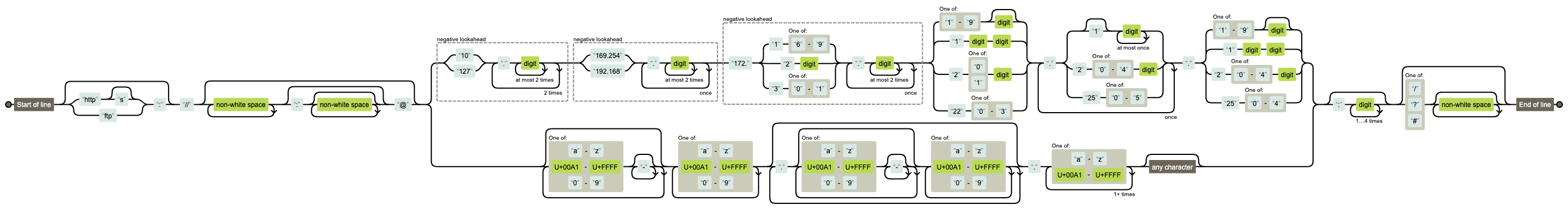 var urlReg = /^(?:(?:(?:https?|ftp):)?\/\/)(?:\S+(?::\S*)?@)?(?:(?!(?:10|127)(?:\.\d{1,3}){3})(?!(?:169\.254|192\.168)(?:\.\d{1,3}){2})(?!172\.(?:1[6-9]|2\d|3[0-1])(?:\.\d{1,3}){2})(?:[1-9]\d?|1\d\d|2[01]\d|22[0-3])(?:\.(?:1?\d{1,2}|2[0-4]\d|25[0-5])){2}(?:\.(?:[1-9]\d?|1\d\d|2[0-4]\d|25[0-4]))|(?:(?:[a-z\u00a1-\uffff0-9]-*)*[a-z\u00a1-\uffff0-9]+)(?:\.(?:[a-z\u00a1-\uffff0-9]-*)*[a-z\u00a1-\uffff0-9]+)*(?:\.(?:[a-z\u00a1-\uffff]{2,})).?)(?::\d{2,5})?(?:[/?#]\S*)?$/