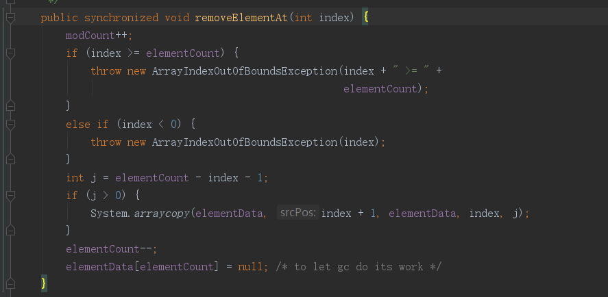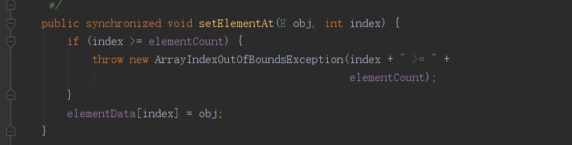 对于Vector的基本方法,不做太多介绍,其实就是对数组的操作,主要,对于数组的移位操作使用的System.arraycopy来完成,还有一个特点相比较ArrayList来说就是他的许多方法都有一个关键字synchronized。这就是为什么说Vector是同步的原因。我们看一下下面的图来体会一下: