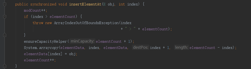 - elementCount: 这个和ArrayList中的size差不多都是用来记录存储元素的数量的,比如现在Vector中有2个元素,这个elemetnCount=2;