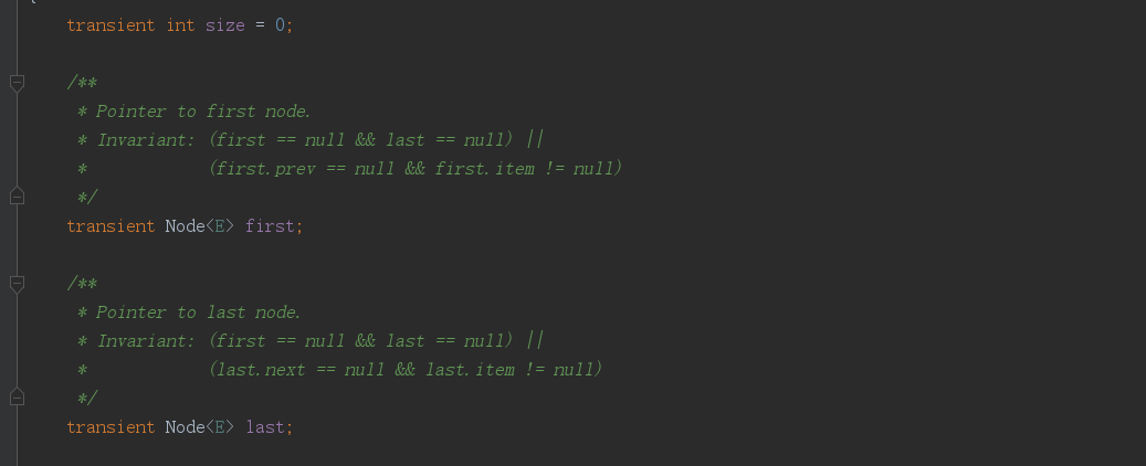 与前几篇文章一样,我们通过查看LinkedList的属性来探讨其存储结构: