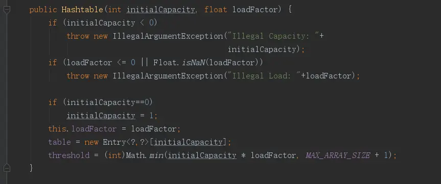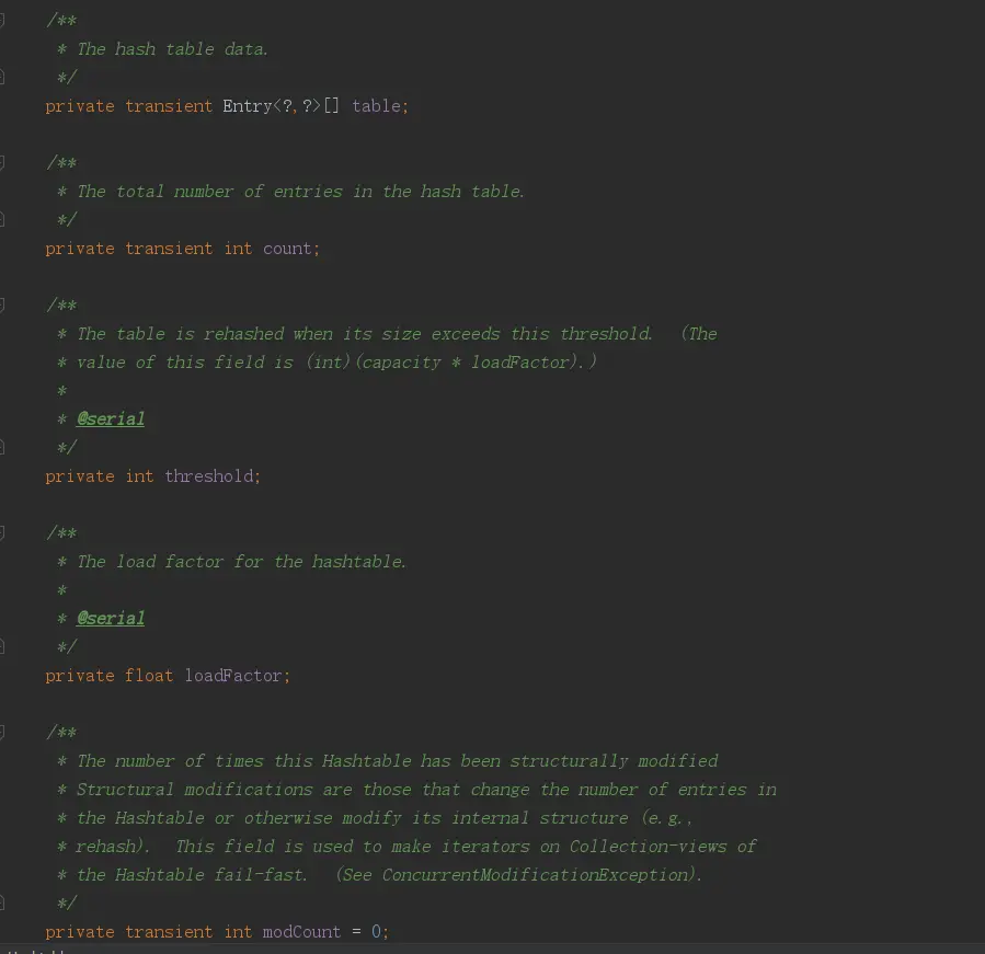 - threshold: 当Hashtable中键值对的数量超过这个值后就会进行扩容操作,这个值等于容量与负载因子的乘积