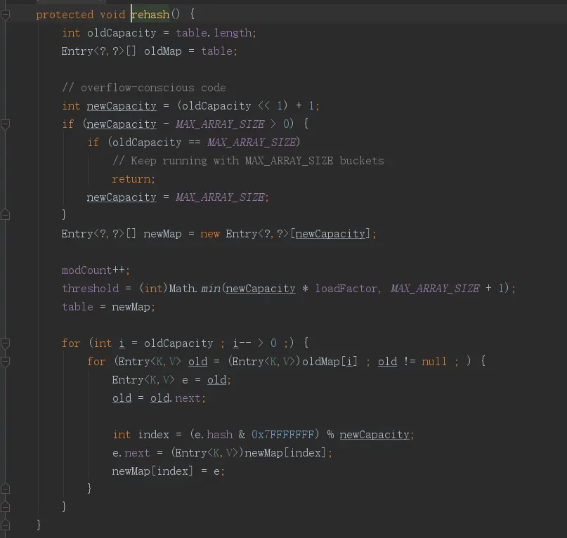 我们直接来看扩容机制,不去看那些大同小异的put方法了。我们看看rehash的源码: