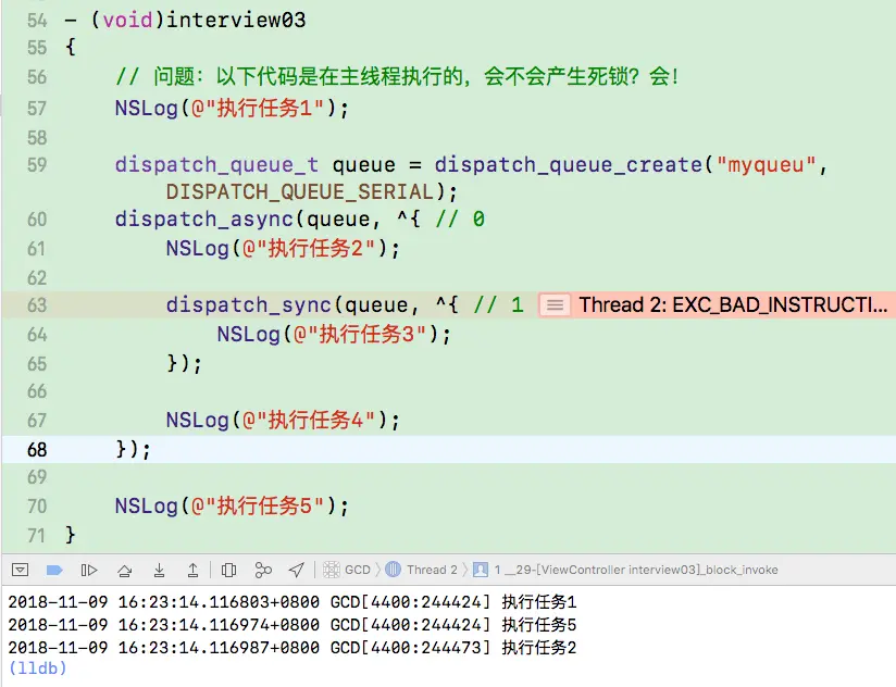 其中在主队列viewDidLoad里面的任务3执行结束才会执行任务2;而主线程中是执行完sync才会执行任务3。也就是任务2等待任务3执行,任务3再也等待任务2执行,造成死锁