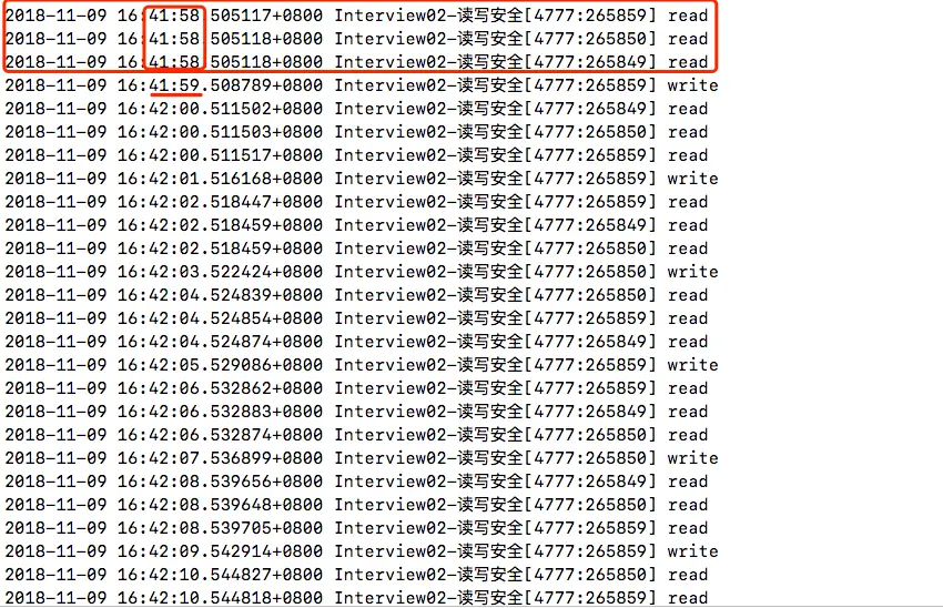我们观察时间可以看到在执行dispatch_barrier_async写操作的时候是同步执行的,不会出现异步情况