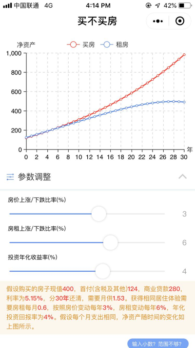 简单介绍一下计算方法。假设相同的现金流的情况下(一开始买房的付出首付,租房的将同样的首付拿去投资,后续每月买房的付出月供;租房的将同样的月供减去房租,剩余的用于投资),计算未来各个时间点下的净资产(买房净资产 = 房屋市价 - 银行欠款;租房净资产 = 退出投资能够获得的资金),再进行对比。