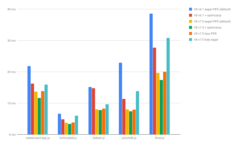 然而,现在我们不再重复解析内部函数,而且由于解析器已经够快了,通过 optimize-js 获得的性能提升也大大减少。实际上,v7.5 的默认配置已经比运行在 v6.1 上的优化版快很多。即使在 v7.5 中,对于启动期间需要的代码,仍然可以少量使用 PIFEs :我们避免了预解析,因为我们一开始就知道是需要这个功能。