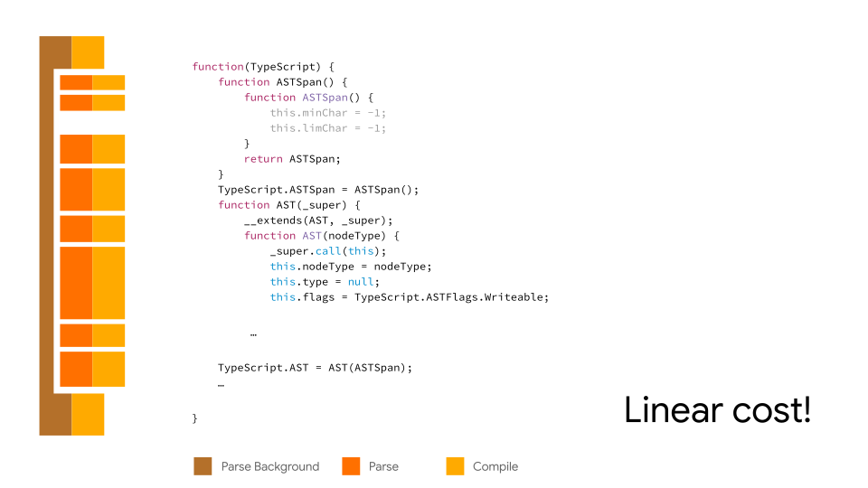 解析是编译器(V8 中,字节码编译器 Ignition)提供的将源代码转换成中间表示的步骤。解析和编译发生在 web 页面开始渲染的关键过程中,而不是这些所有的功能在页面启动期间需要立即给浏览器提供。尽管开发人员可以使用异步和延迟脚本,但这不是一直都能生效的。此外,许多 web 页面只提供某些功能所使用的代码,在页面小部分的运行期间,用户可能根本无法使用这些功能。