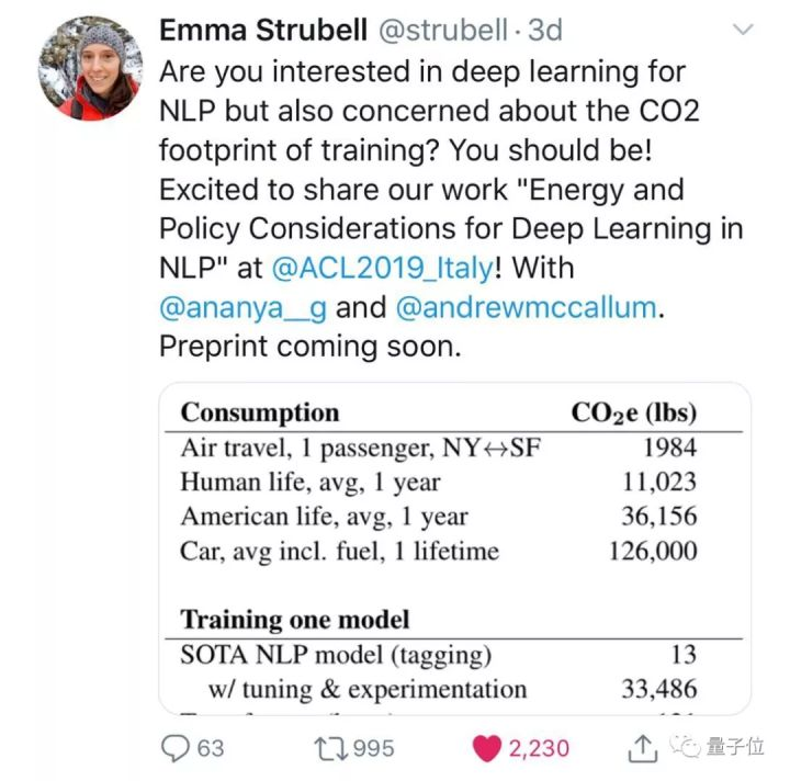 如果看艾玛提供的数据,训练好一只NLP领域的State-of-the-Art,包括调参包括实验,大概需要排放3.3万磅二氧化碳,相当于15吨: