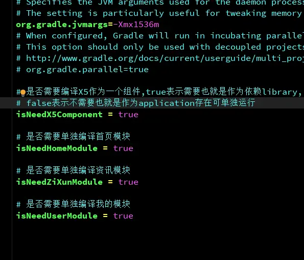 对于是否要将模块或组件单独运行,我们需要定义变量去控制,还是以demo为例,我们在project的gradle.properties文件中定义如下: