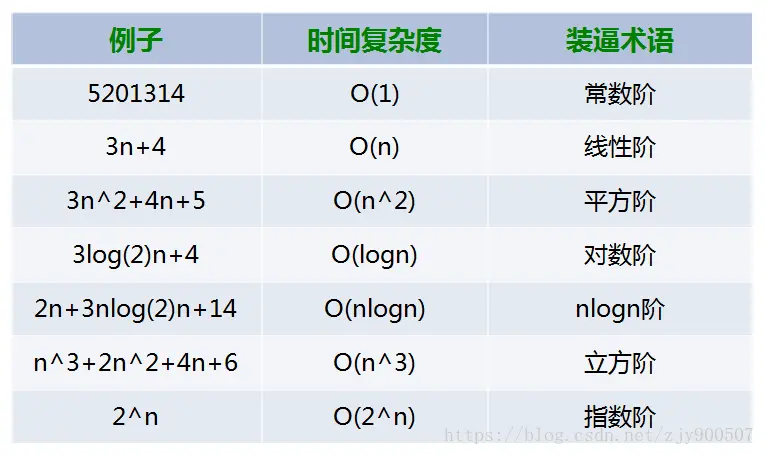 包括 O(1)(常数阶)、O(logn)(对数阶)、O(n)(线性阶)、O(nlogn)(线性对数阶)、O(n2) (平方阶)、O(n3)(立方阶)。