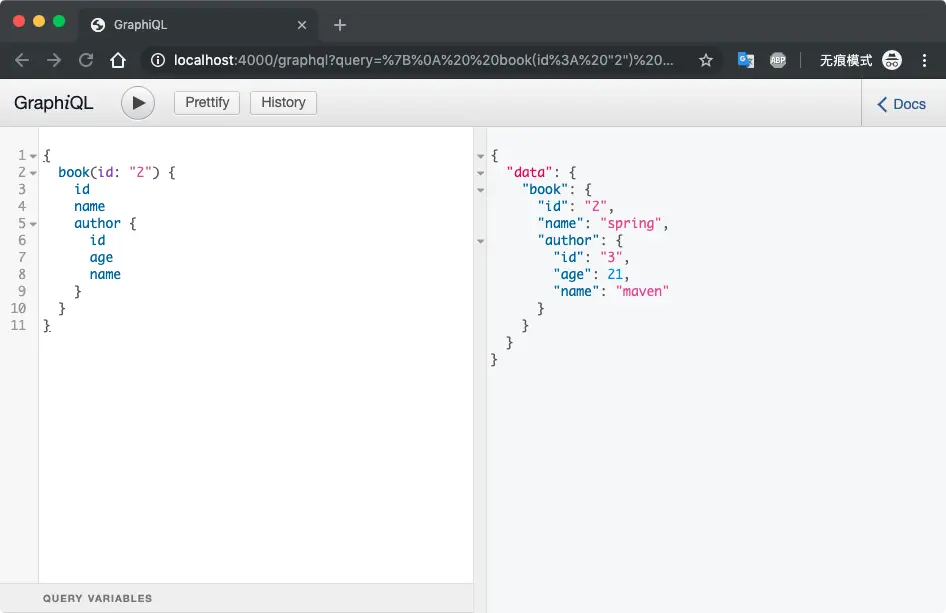 关联关系是书本数据中都会有一个 authorId 字段,表示书本关联的 Author 的id,然后在BootType中去定义一个作者的信息,然后处理查询逻辑