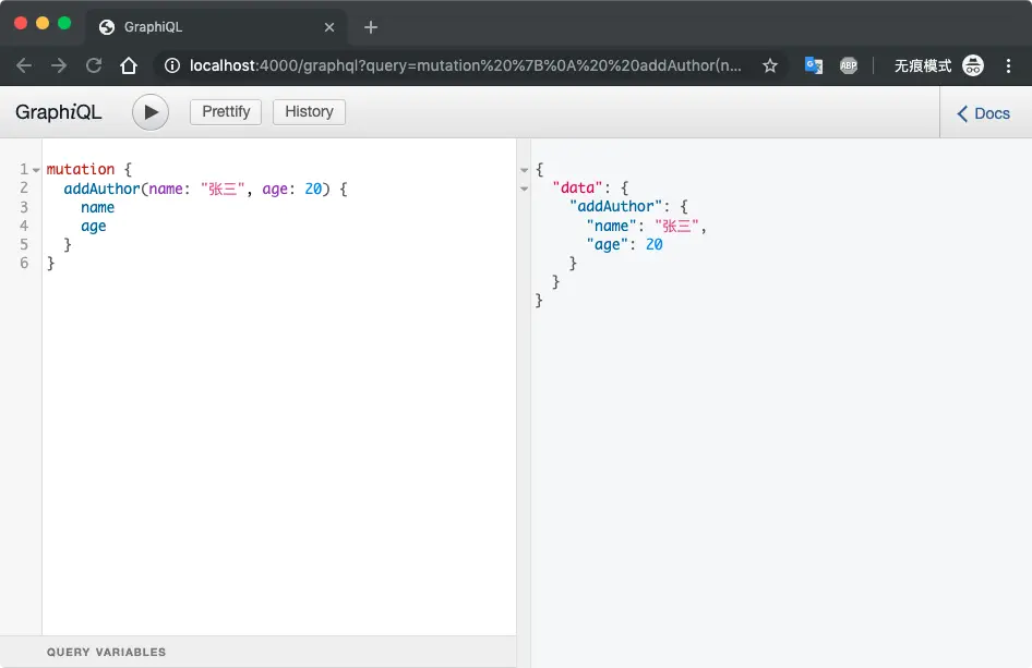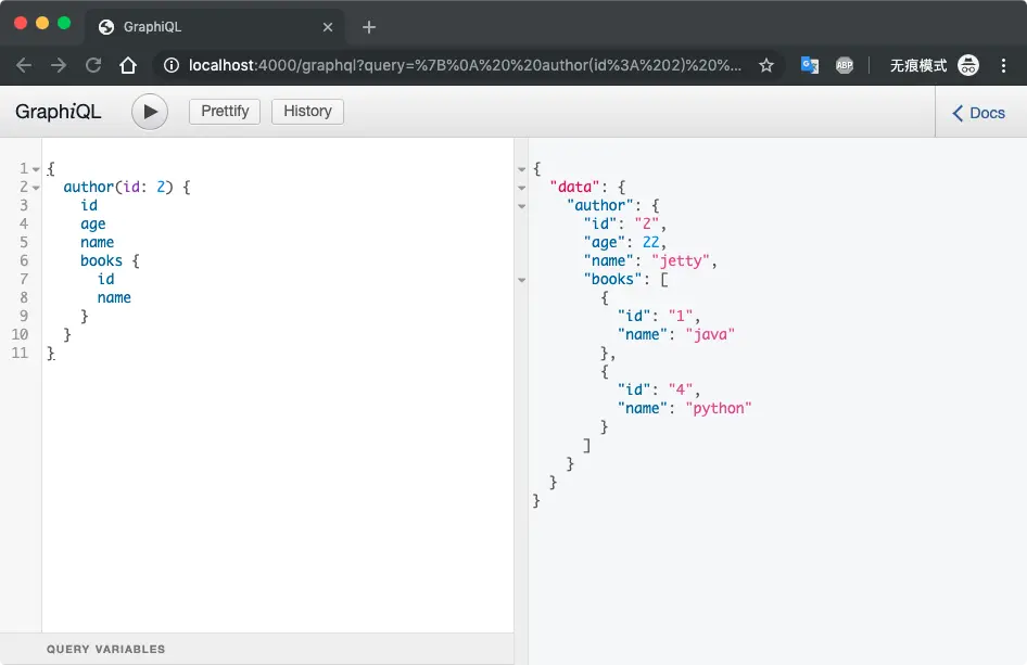 不过一个作者可能有多本书,那么在作者里的书的类型就要是个list了,graphql里提供的有一个 GraphQLList 类型,用法如下