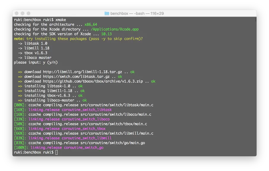 通常情况,编译默认平台执行敲xmake,执行构建期间,xmake不会依赖其他第三方构建工具,连make也不依赖,也不会生成IDE/Makefile文件, 而是直接调用的编译工具链进行编译,默认会根据cpu核数自动开启多任务加速构建。
