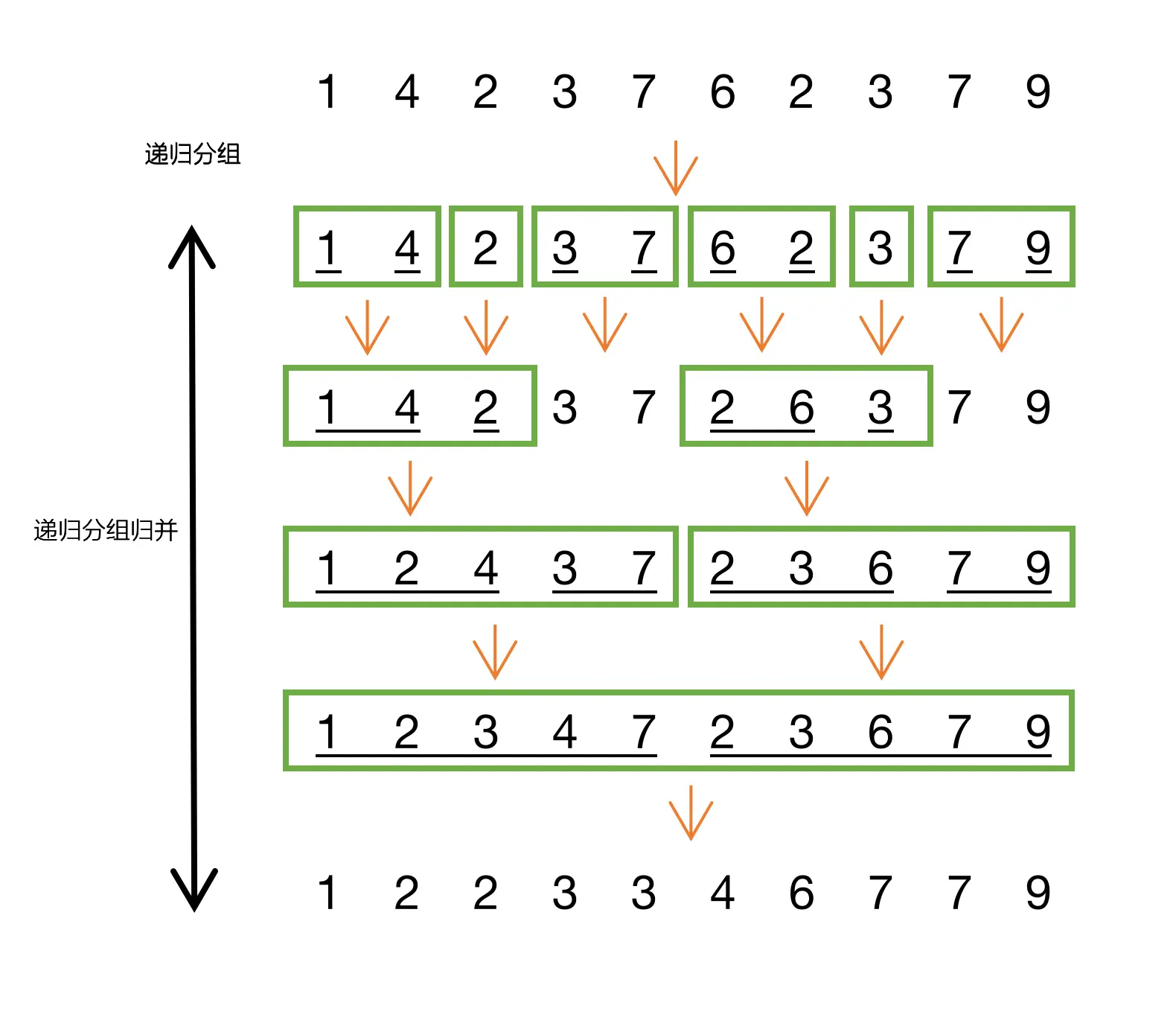 自顶向下的归并排序算法是典型的采用高效算法设计中分治思想的例子。递归将数组平分,直到比较的两个数组都是一个,然后自底向上进行归并。