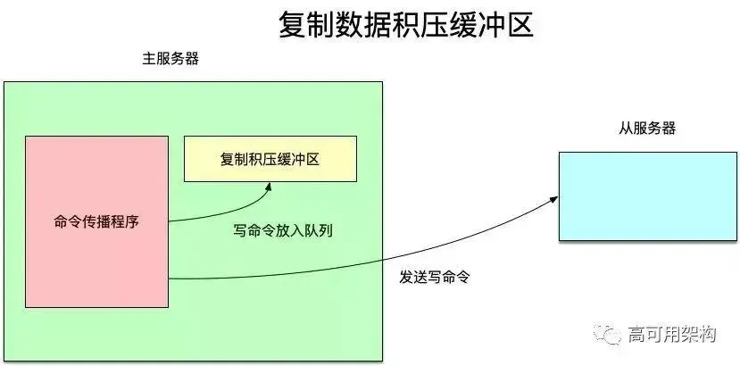 在主服务器进行命令传播时,不仅会将写命令同步到从服务器,还会将写命令写入复制积压缓冲区。