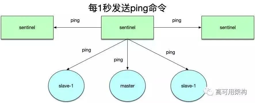 每隔1秒,每个哨兵节点向主、从数据节点以及其他sentinel节点发送ping命令做心跳探测,这个心跳探测是后续主观判断数据节点下线的依据。