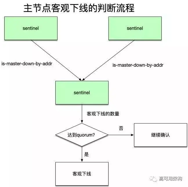 当一个哨兵节点认为主节点主观下线时,该哨兵节点需要通过”sentinel is-master-down-by addr”命令向其他哨兵节点咨询该主节点是否下线了,如果有超过半数的哨兵节点都回答了下线,此时认为主节点“客观下线”。