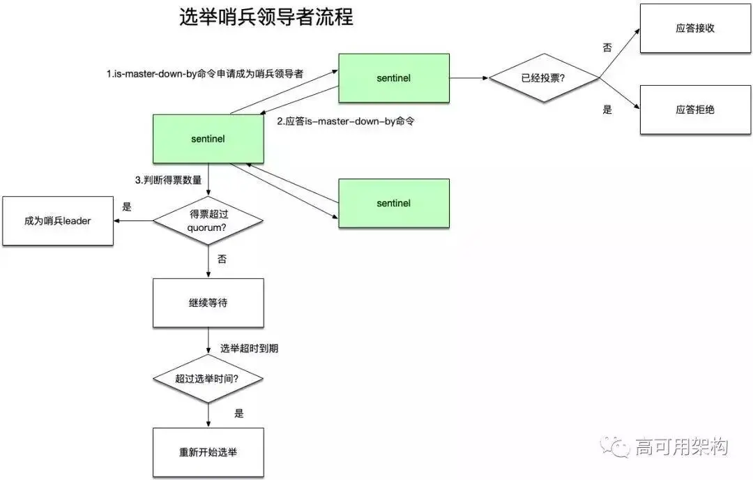 每个哨兵节点通过向其他哨兵节点发送”sentinel is-master-down-by addr”命令来申请成为哨兵领导者。