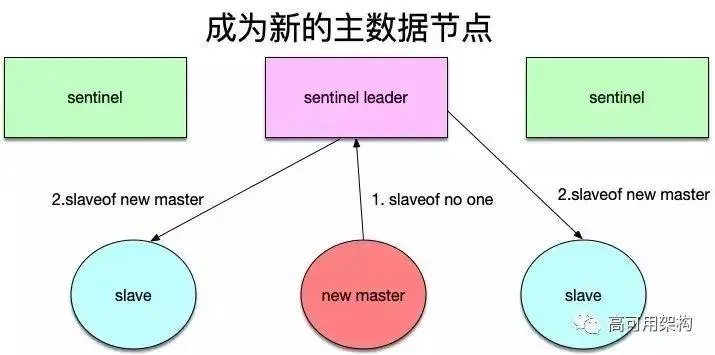 哨兵领导者向上一步选出的从节点发出“slaveof no one”命令,让该节点成为主节点。