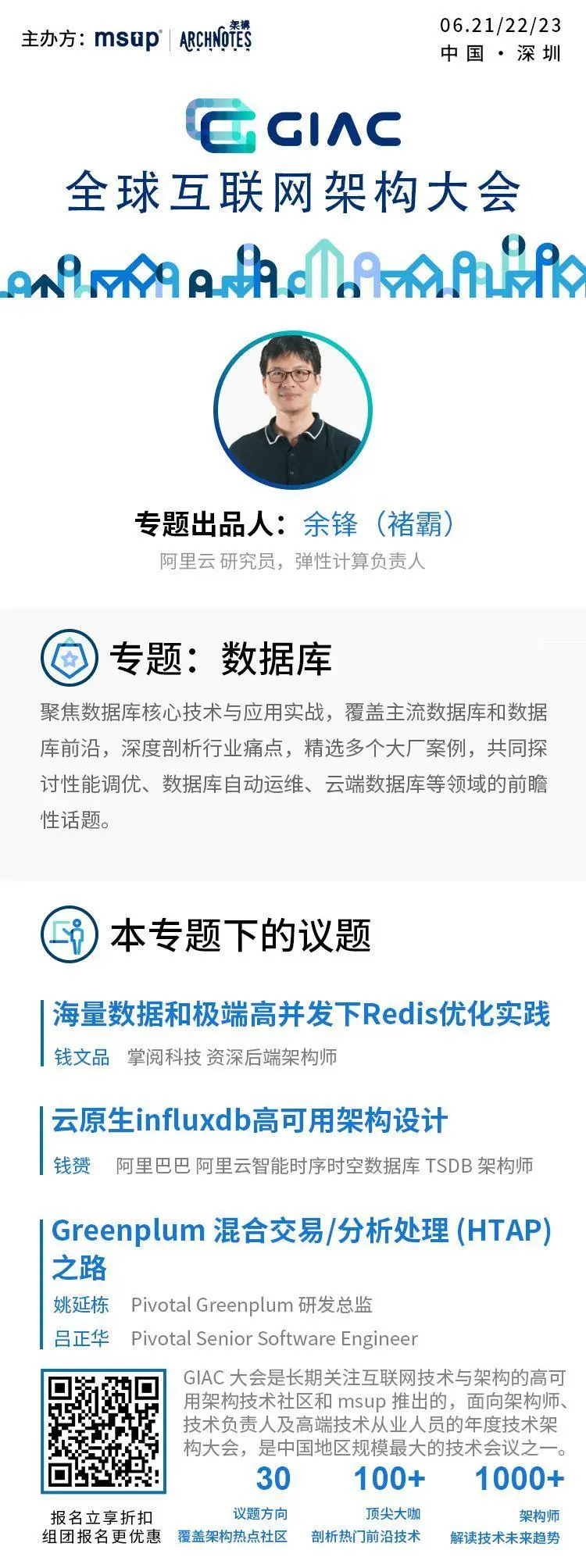 如果过程中哨兵领导者失效怎么办?不妨来6月21-23日即将于深圳举办的GIAC全球互联网架构大会听听掌阅资深架构师,畅销图书《Redis 深度历险:核心原理与应用实践》作者钱文品怎么说,他将作为数据库专场的讲师出席2019年GIAC深圳站,并做关于Redis高性能,高可用方面的的演讲。此外,阿里云前数据库总负责人余峰将作为本专场的出品人,具体议题如下: