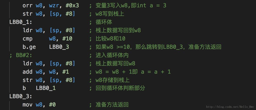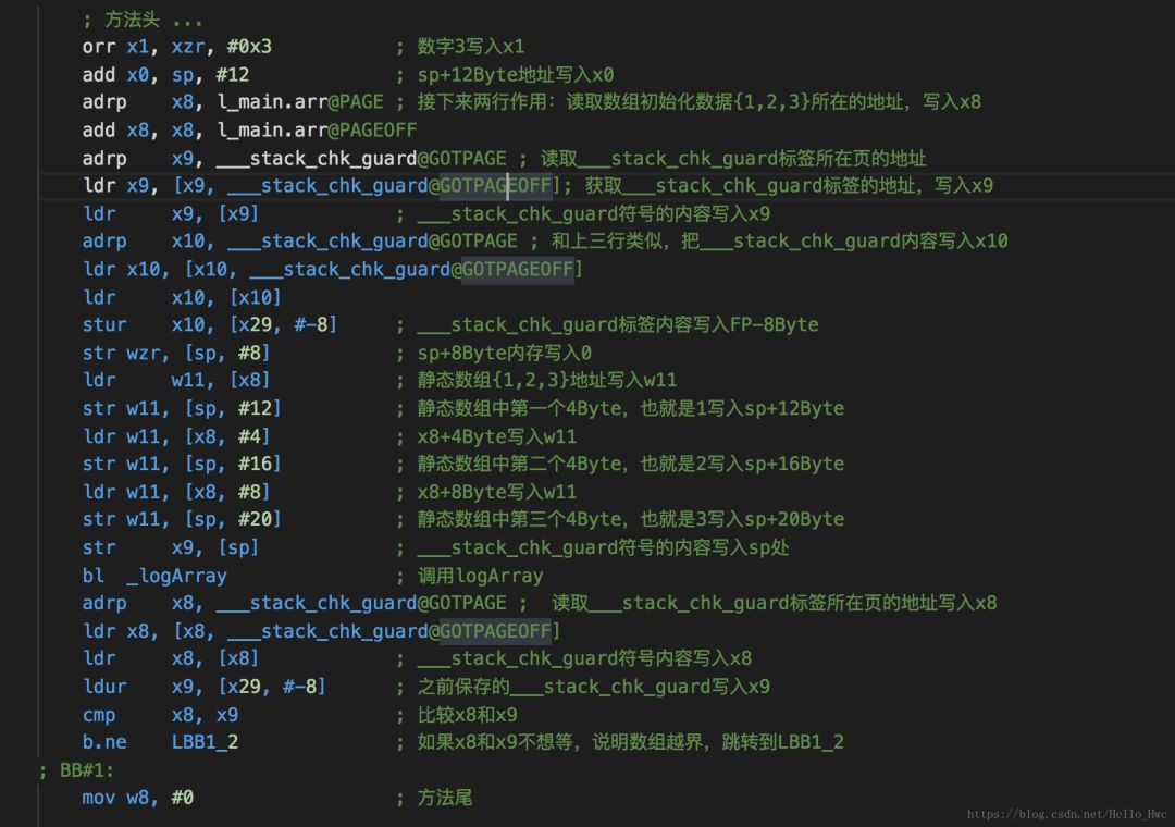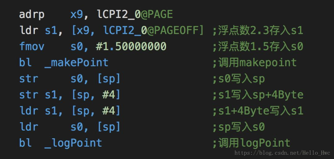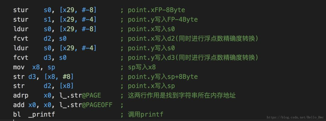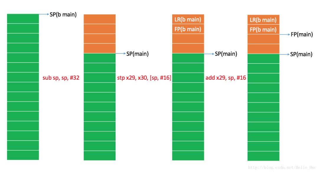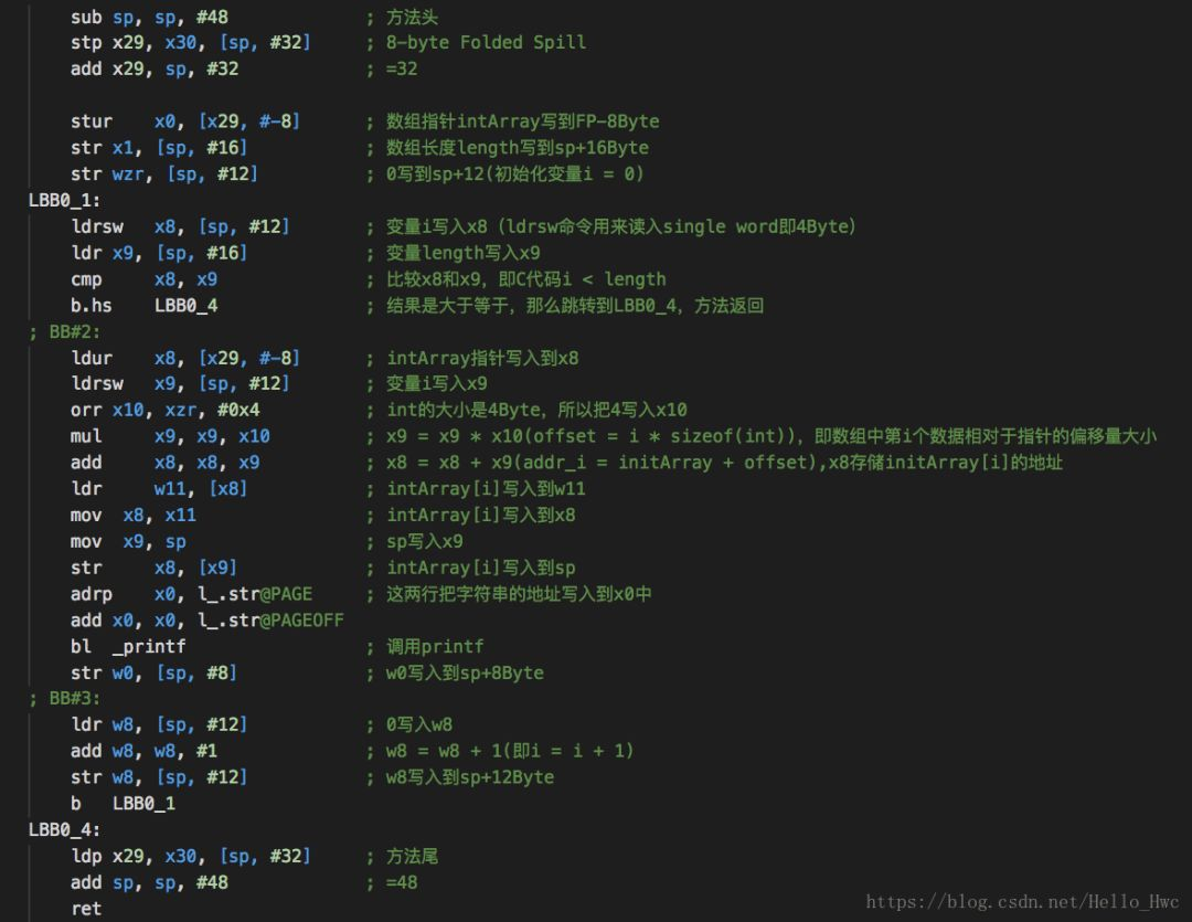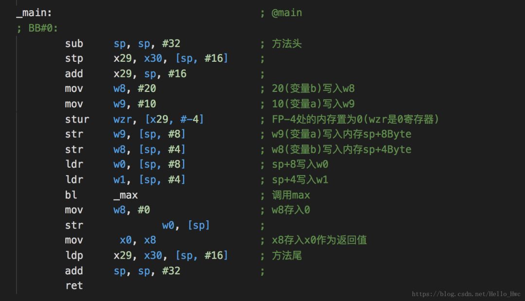 //方法头sub sp, sp, #32 ; =32stp x29, x30, [sp, #16] ; 8-byte Folded Spilladd x29, sp, #16 ; =16bl _printf //子程序调用//方法尾ldp x29, x30, [sp, #16] ; 8-byte Folded Reloadadd sp, sp, #32 ; =32