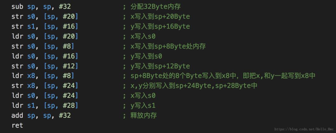 函数内部,从x0/x1中读取参数,然后把临时变量存储到栈上
