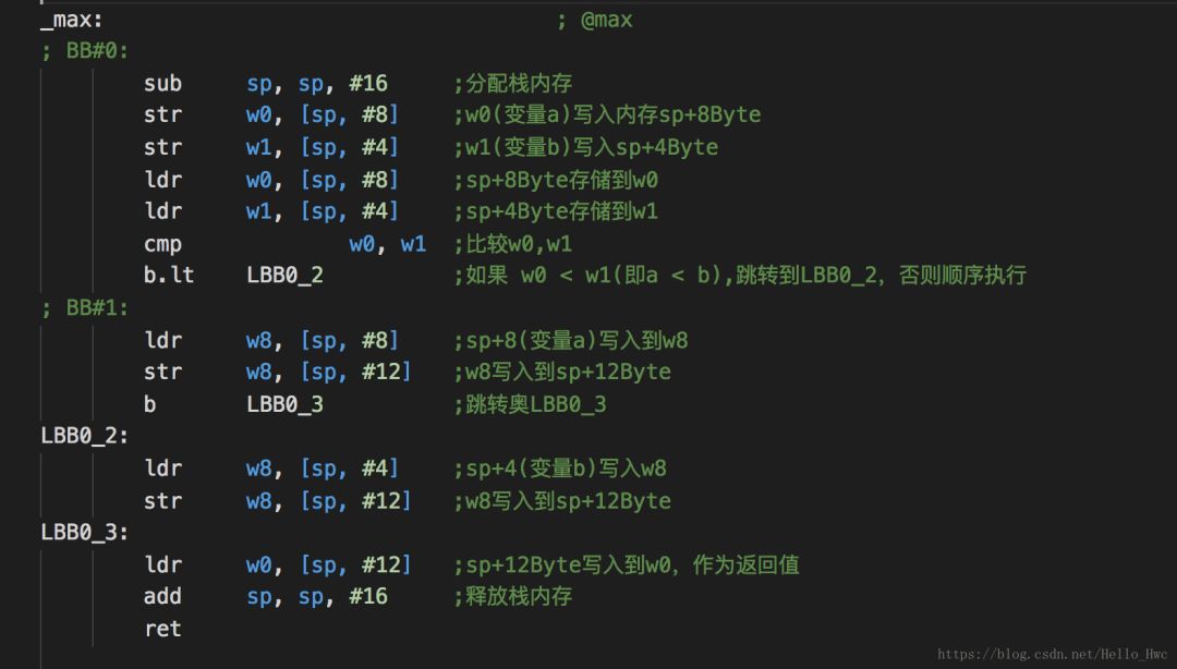 ldr w0, [sp, #8] ; sp+8写入w0ldr w1, [sp, #4] ; sp+4写入w1bl _max ; 调用max