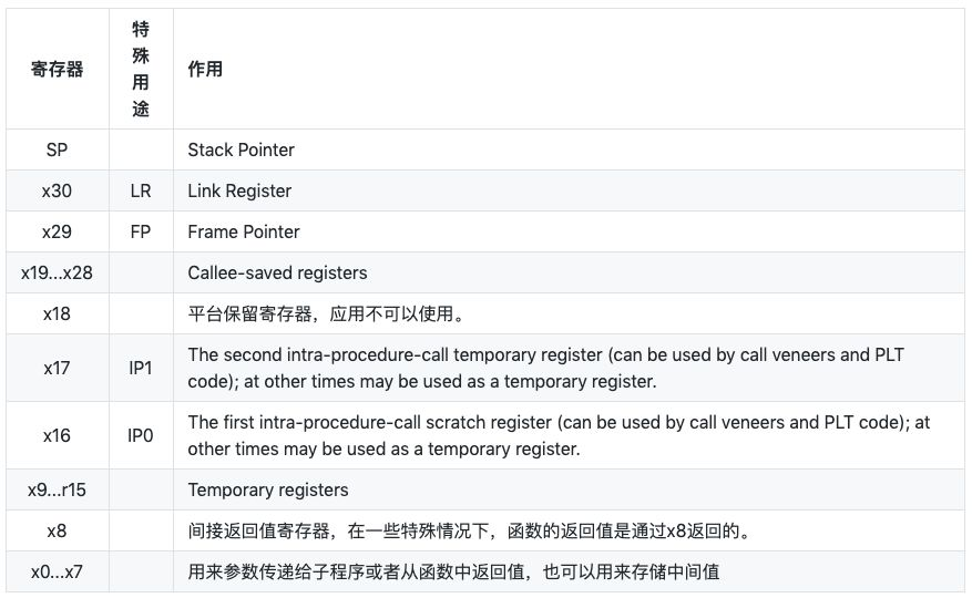 ARM64常见的的通用寄存器31个64bit,命名为x0-x30,作用: