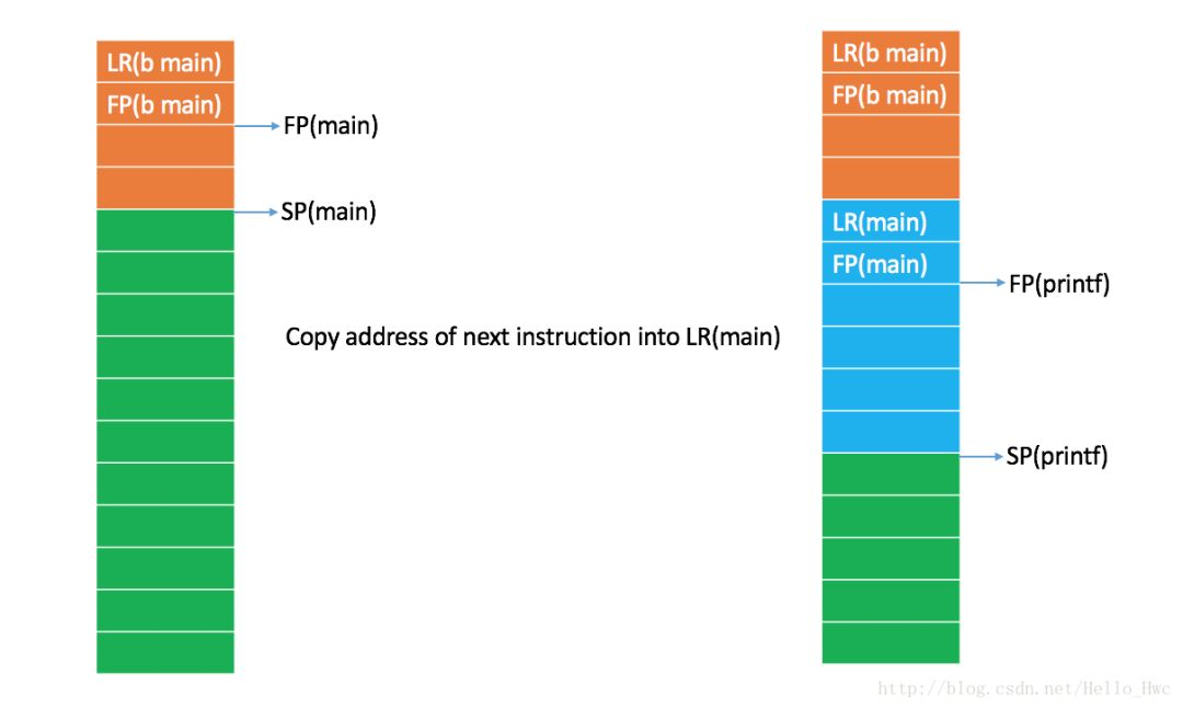 调用bl _printf的时候,bl命令首先会拷贝下一条执行的指令到LR,这样子程序返回的时候才知道在哪条指令处继续执行。
