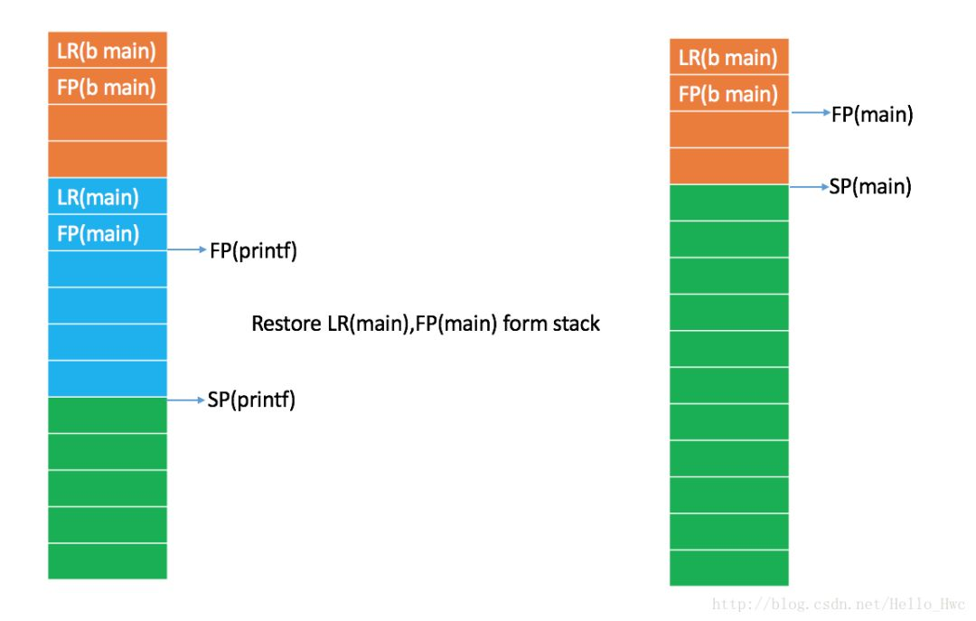 在printf返回的时候,首先从栈上恢复main函数的LR和FP,然后释放栈空间。可以从图中看到,方法返回后FP和SP都和调用printf之前一致。