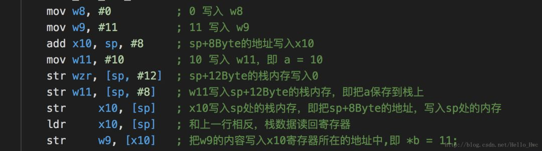 mov w9, #11 ; 11写入寄存器w9add x10, sp, #8 ; x10中存储sp+8Byte的地址,这里x10表示的就是后续的指针变量bmov w11, #10 ; 10(变量a)写入w11str w11, [sp, #8] ; w11(变量a)写入sp+8Byte处的内存,即把变量a存储到栈上,这一行str w9, [x10] ; 把w9的内容写入x10寄存器所在的地址(sp+8Byte),即 *b = 11;