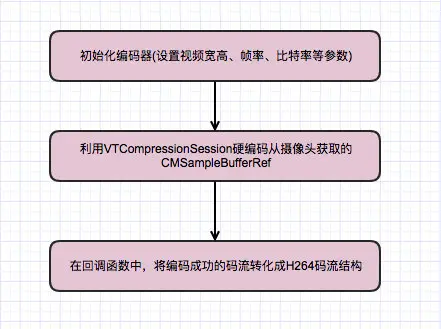 第2步:设置编码器类型为kCMVideoCodecType_H264,通过VTSessionSetProperty方法和 kVTCompressionPropertyKey_ExpectedFrameRate、kVTCompressionPropertyKey_AverageBitRate等key分别设置帧率和比特率等参数。