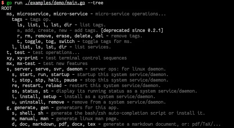 现在我们可以将 demo 跑起来看看了。首先研究下有什么命令行指令可供使用,我们采用 --tree 来看看: