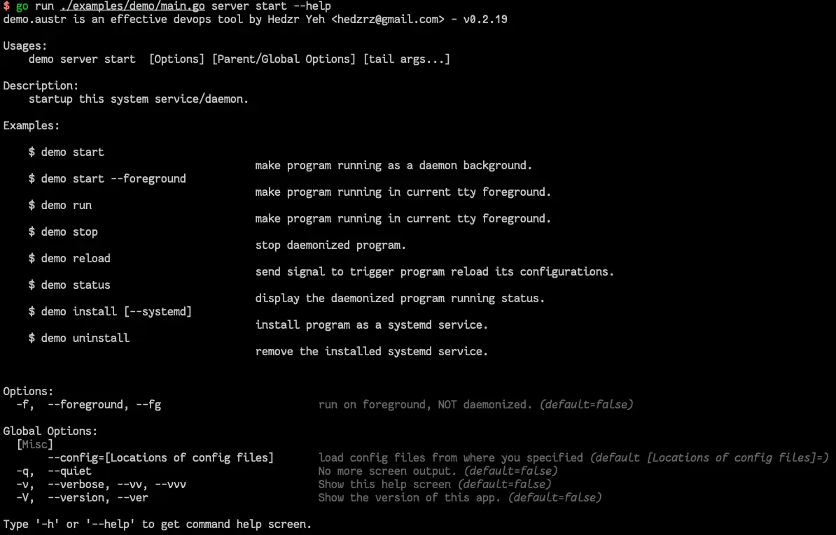 cmdr 除了提供命令行参数的解释能力之外,也额外提供了一个daemon插件,它可以帮助你简化日常开发工作,也令你不必关心 pid 文件、日志、退出信号等等问题,也无需重复编排 daemon 相关的命令行指令。