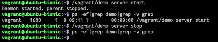通过 vagrant 环境,我们可以看到守护进程启动了,然后被我们的 stop 指令正确地关闭了。