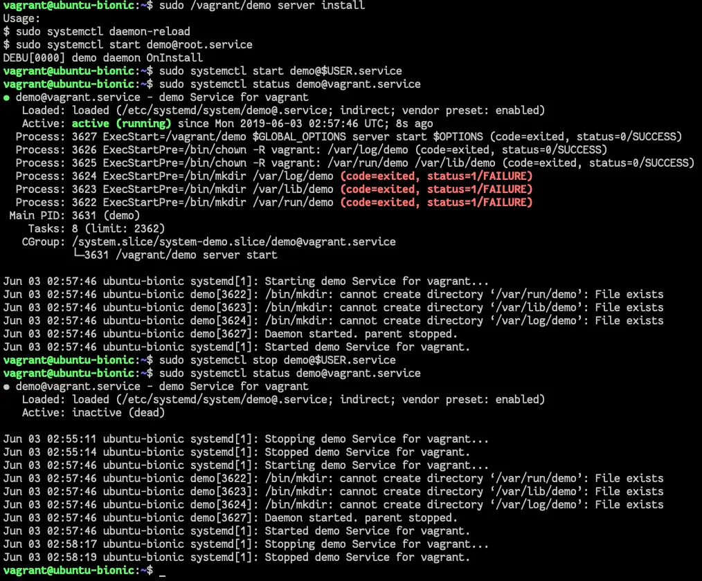 其中,sudo /vagrant/demo server install 完成安装动作,成功之后demo服务就安装就绪了,并且已经被预设为随系统启动而自动启动的模式。