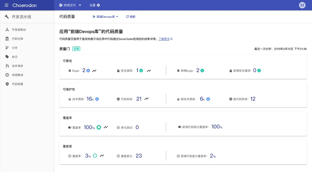 - 开发流水线模块新增代码质量页面,支持查看应用在SonarQube中的检测结果与具体详情。